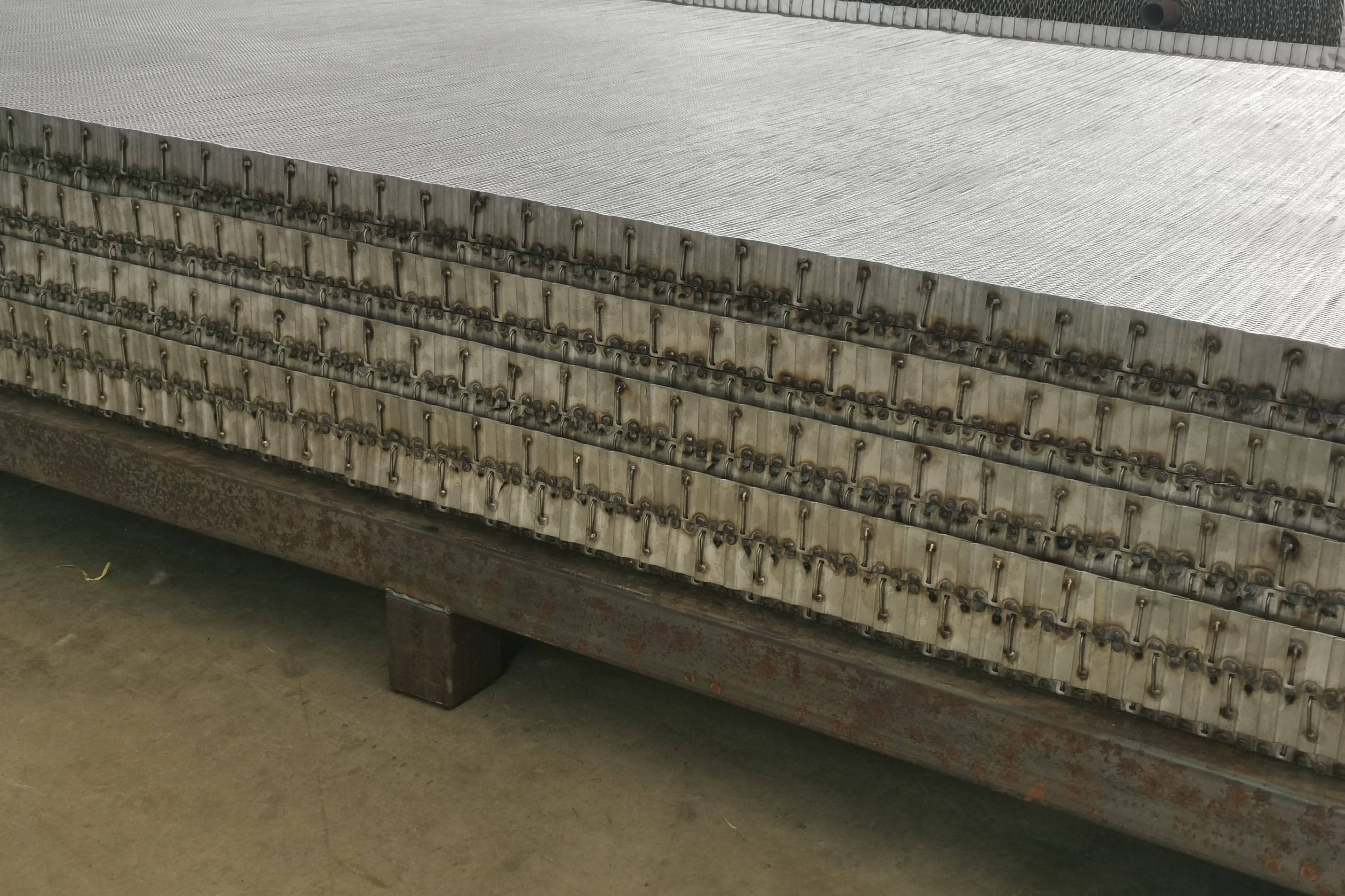 粉末冶金燒結網(wǎng)帶是多用于粉末冶金制品燒結爐,將同一方向的螺線交互編入,在交叉處把力骨線穿過去的型式。